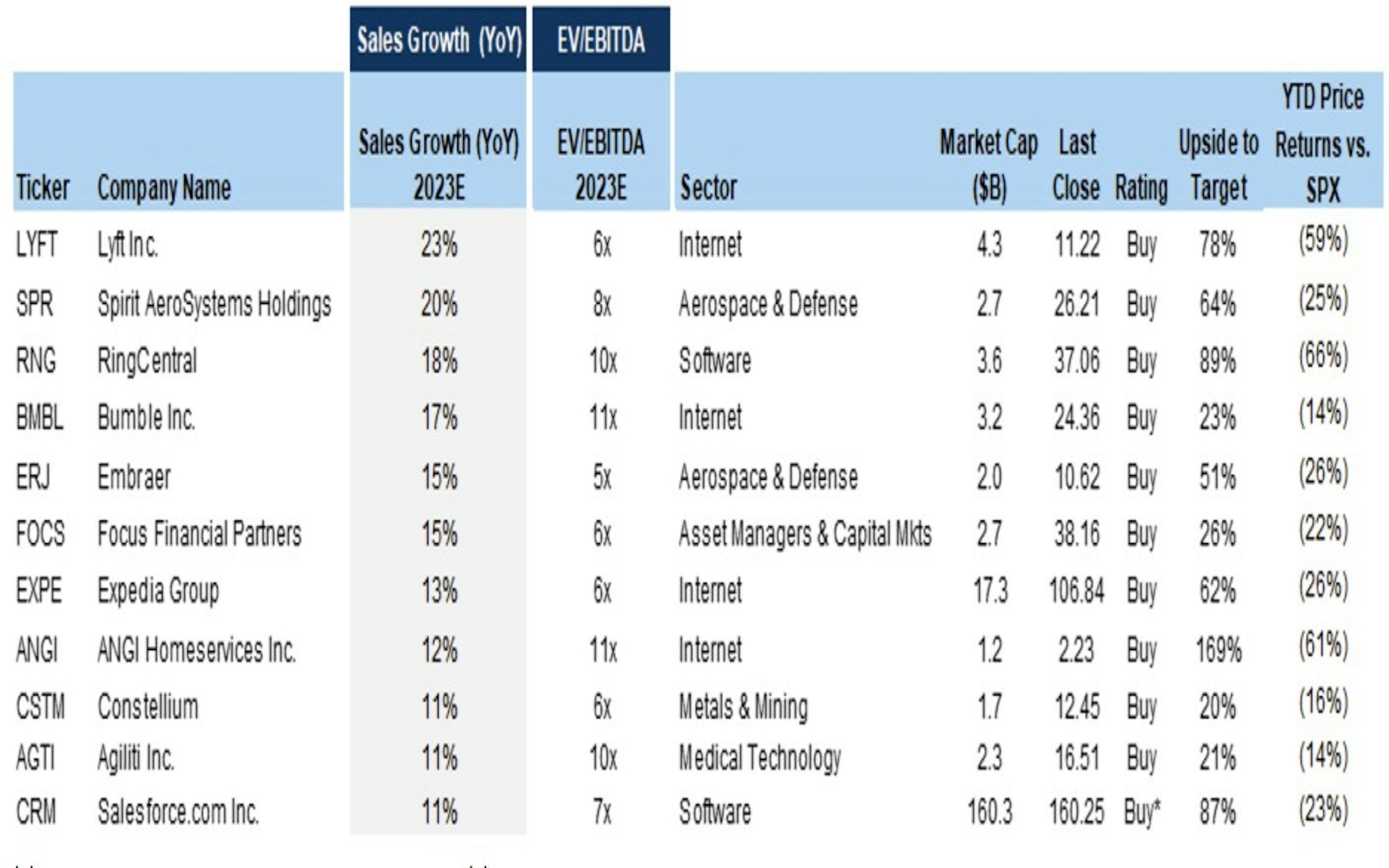 Buy-rated laggards with at least 10% upside, plus estimated 2023 sales growth of 10%+, EV/EBITDA of 12x or lower.