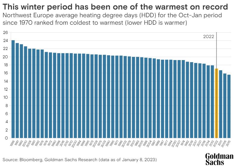 The winter that wasn't. Mild weather is driving down demand for energy as Europe has one of its warmest winters on record. In the past two weeks, the price of natural gas on both sides of the Atlantic has dropped by around 20%, dragging down oil and grains as well. However strategists in Goldman Sachs Research are still bullish on oil and commodities this year as China reopens its economy faster than expected.