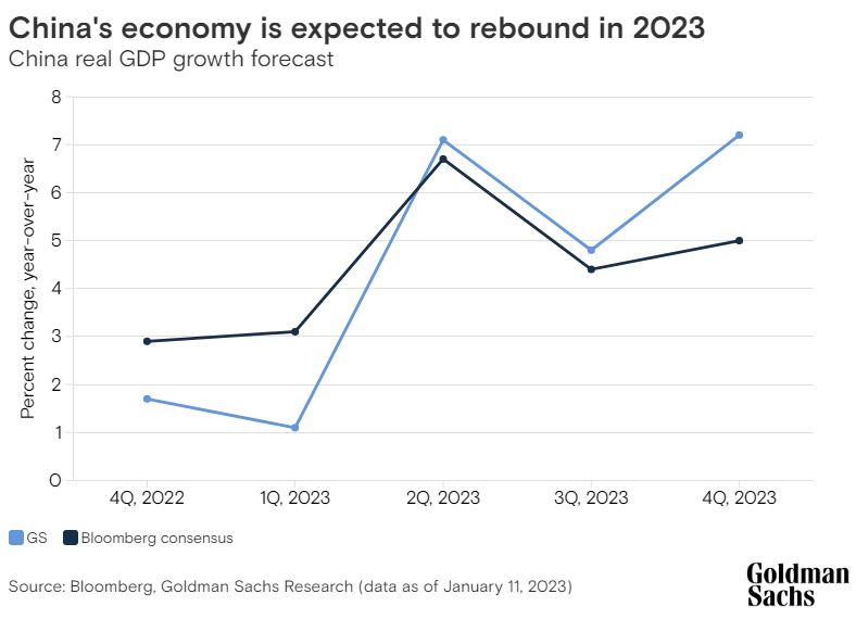 “Markets are priced for a 2023 recession, positioned firmly risk off and ill-prepared for a Chinese reopening, fewer gas constraints on European industry and a more resilient than expected U.S. economy,” Jeff Currie, the global head of commodities research in GS Research, wrote in the team's report. Goldman Sachs Research estimates that a faster reopening in China could add $5 per barrel to the oil price forecast in 2023. Our strategists expect Brent crude to rise to $105 in the next 12 months from $80 per barrel now.