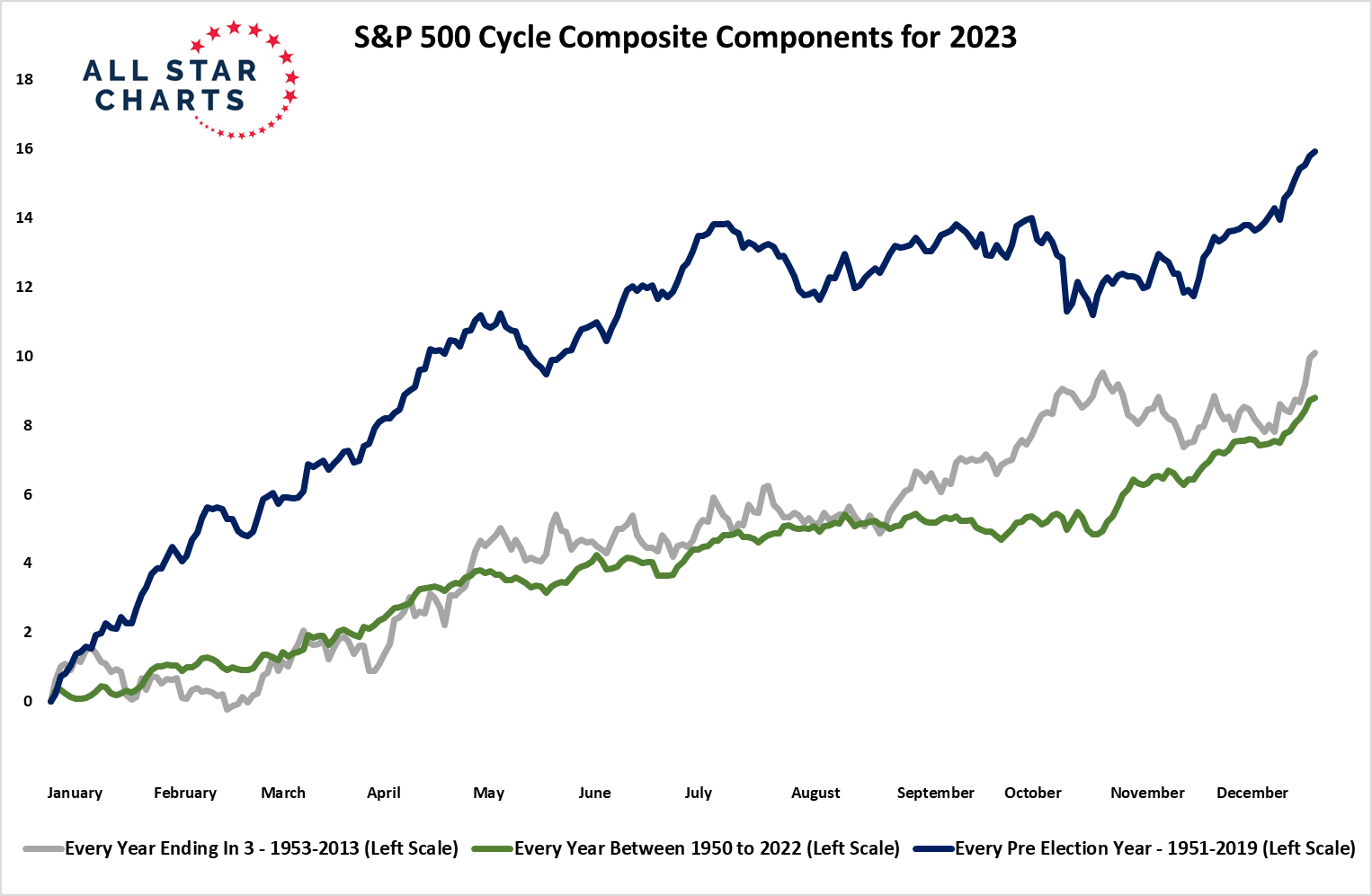 Here's a breakdown of our Cycle Composite for 2023. This includes every year since 1950, all of the Pre-Election Years since then, and of course, every 3rd year for the Decennial Cycle: