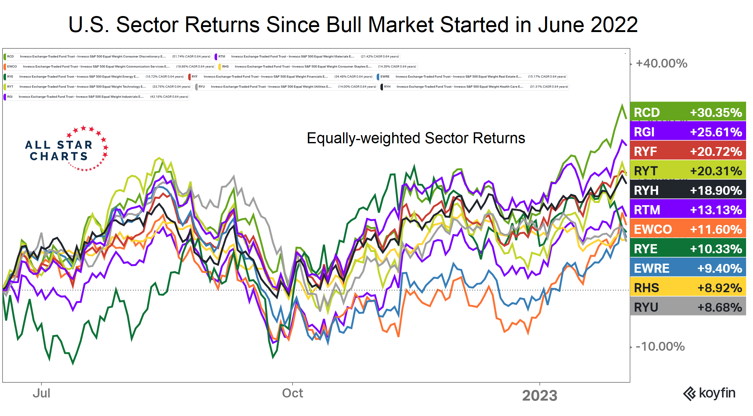 Look the returns of each of the US Sectors since the Bull Market started last June: